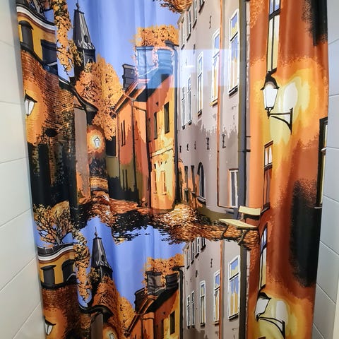 Kukkakuvioinen suihkuverho . Käteisellä . Ei postitusta . Hyvinkää .
