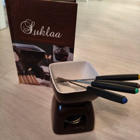 Sydämenmuotoinen suklaafondue. Käytetty muutaman kerran. Sydämessä näkyvä halkeama, mutta edelleen käyttökelpoinen. Mukana 2 haarukkaa.