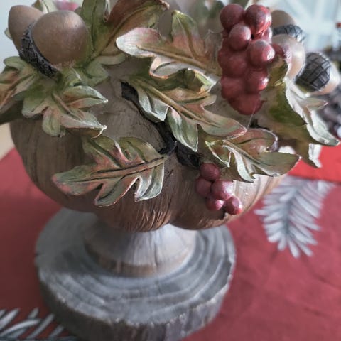 Metallinen kynttilänjalka,Tammen lehtiä ja verhoja kuvaava metallinen kynttillänjälka jossa on kolme kynttilänpidikettä. Sopii koristekäyttöön ja kynttilöiden tukemiseen.