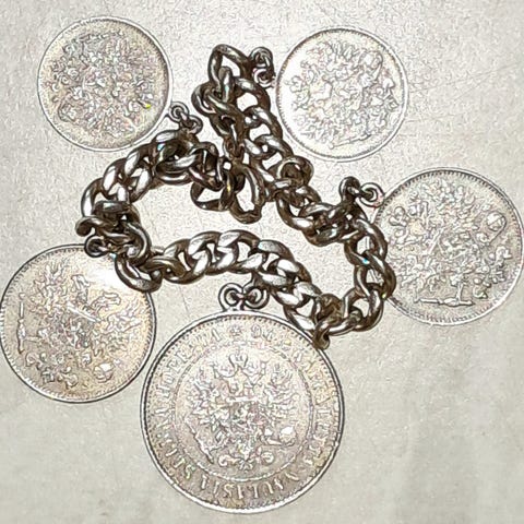 Vanha rannekoru hopearahoista. Tsaarin aikaisia 25 pennin hopearahoja 11 kpl. Kokonaispituus noin 20 cm. Voin postittaa tarvittaessa postin hinnaston mukaan/nouto Vantaalta.