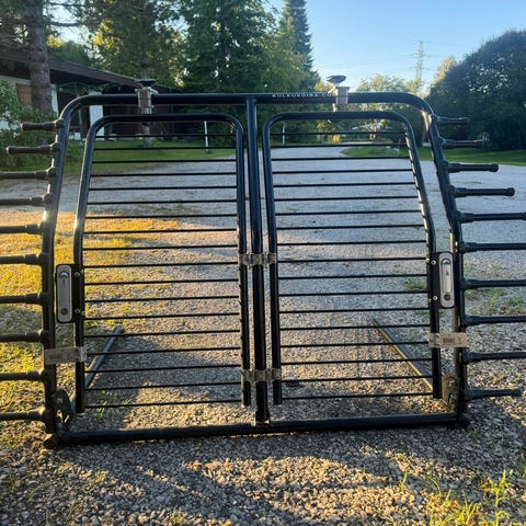 Noin 3 vuotta vanha veräjä. Ollut käytössä 2016 mallissa, mahtui myös 2018 vuosimalliin mutta on tiukka sovitus sivu suunnassa. Kaikki avaimet tallessa ja lukot toimii.