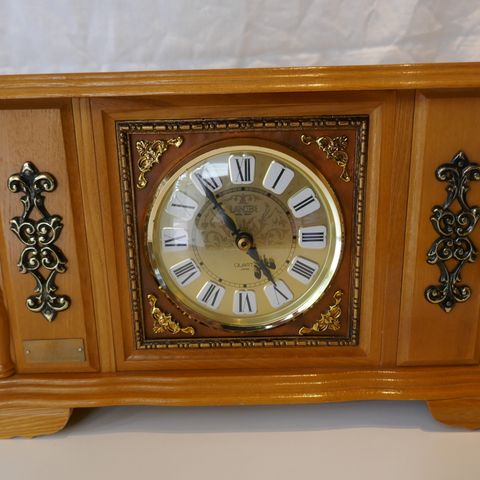 Tyrolilaistyylinen Pöytäkello, jossa on koristeellinen kellotaulu ja roomalaiset numerot. Kellon kehys on maalattu kukkakoristein, ja sen värit ovat luonnonpuu ja punainen. Korkeus 35 ja leveys 25 cm. Kello toimii paristoilla ja toimii.