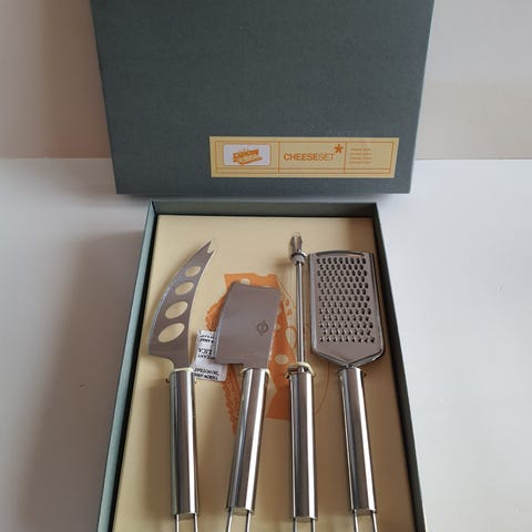 Käyttämätön kaunis setti juuston tarjoiluun. Ruostumatonta terästä ja kahvat akaasiapuuta.
