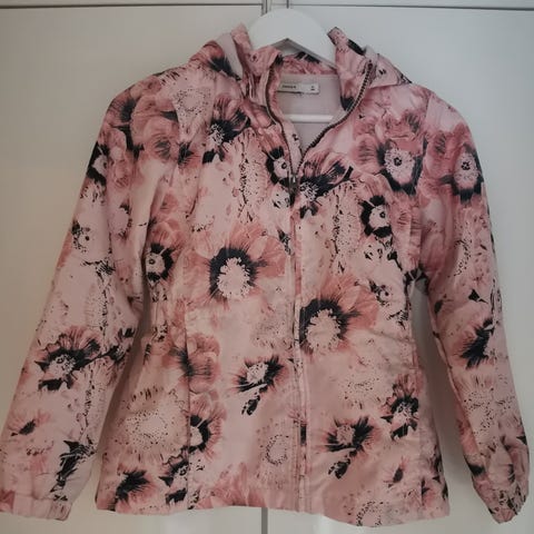 Name it lasten takki, koko 140, valmistettu polyesteristä. Takista puuttuu huppu, muuten ehjä.