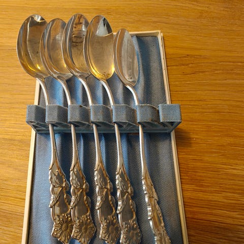 Kahvilusikoissa 6 kpl on koristeellinen kahva, valmistettu metallista, mahdollisesti alpakkahopeaa.