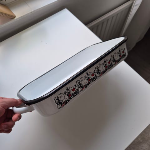 Myydään Muurlan emaliuunivuoka, muumikuviointi kummallakin pitkällä sivulla. 34x21x6cm. Ollut melko vähäisessä käytössä.