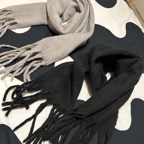 Uusi huivi, laput kiinni vielä. Kauniit sävyt huivissa.