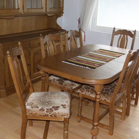 Harvinaisempi koko setti; pöytä ja yhteensä 8 tuolia eli myös tyyliin kuuluvat käsinojalliset päätytuolit.