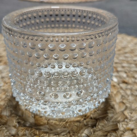 Iittalan Kastehelmi kynttilälyhty sammaleenvihressä sävyssä. Halkaisija 64mm. Kynttilälyhty on ehjä ja hyväkuntoinen sekä alkuperäisessä pakkauksessaan.