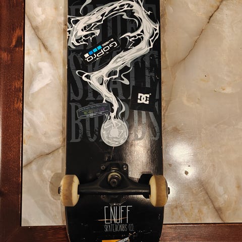 Käytetty skateboard, merkki tony hawk, jossa näkyvää kulumaa ja käytön jälkiä. Sopii skeittaukseen ja temppujen harjoitteluun.