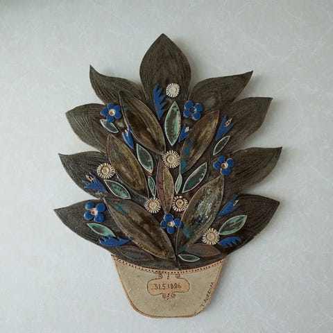 Harvinainen kaunis kukka aiheinen reliefi / taulu / seinätaulu . Tekijänä Hilkka-Liisa Salmi . Teos on muotoiltu puupohjalle ja viimeistelty maalaamalla.