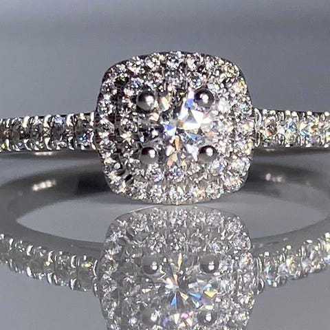 • Style: Halo – center stone with surrounding diamonds, diamonds also along the band