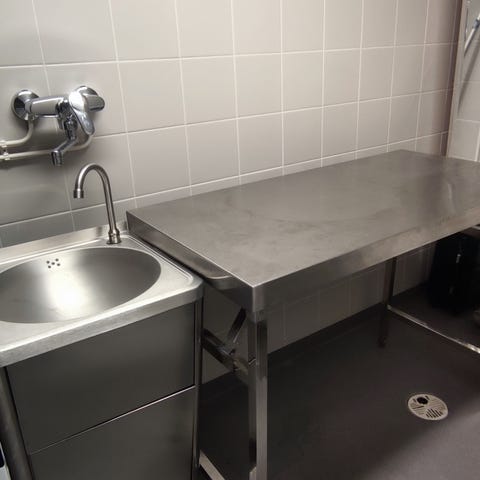 Pöydässä seinämä työkaluille ja vetolaatikko