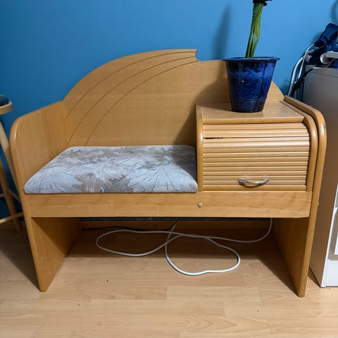 Eteisen penkki. Kaksi vetolaatikkoa. Tuunattu vanhasta, ei täydellisessä kunnossa ( pinnassa kulumaa ) mutta kaikin puolin ehjä.