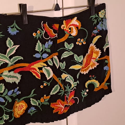 Kaunis minihame ruusukuviolla. Kangas miellyttävän pehmeää ja kevyttä viskoosia. Kunto ok. Kokomerkintä 12, koko arviolta M-L.