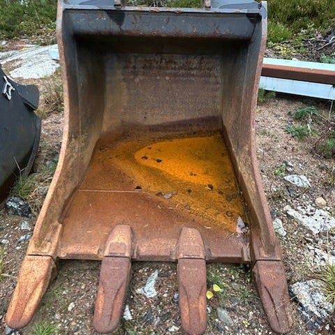 NTP 20 kuokkakauha. Huuli: 129cm. Syvyys: 167cm. Leveys ylhäältä: 88cm. Kiinnityksen yläpintaan: 115cm. Paino: n. 850kg. Huuleen on hitsattu lisää n. 200kg. Hitsaajan työ on ollut 10/10.