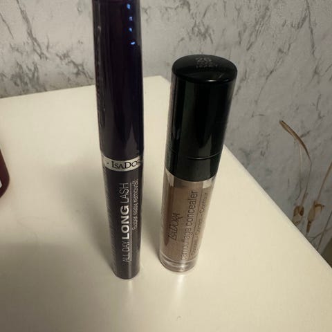 Isadora All Day Long Lash ripsiväri sävyssä 20 Black ja Camouflage Concealer peitevoide sävyssä 24 Sand. Tuotteet sopivat silmämeikin tekoon ja ihon virheiden peittämiseen.