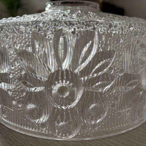 Lasinen kattolampun kupu/varjostin. Myydään ILMAN JOHTOA koska johto mennyt rikki; kuvassa johto vain esimerkkinä. Sopii standardi lampunjohdon E27 kanssa (johtoja myy esim Clas Ohlson ja Puuilo). Varjostimen halkaisija n. 40cm. Keskellä olevan aukon halkaisija 4cm. Kunto kuin uusi, ei mitään näkyviä vikoja. Onnistuu myös noutona Espoon Leppävaarasta.