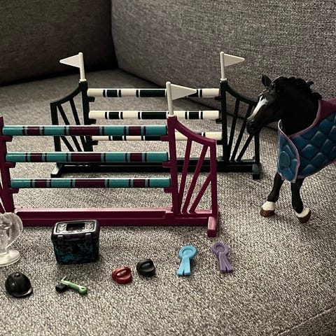 Schleich-hevossetti, jossa maneesi, aitaus, tarvikkeita (mm. lääkärilaukku) ja 2 kpl hevosia