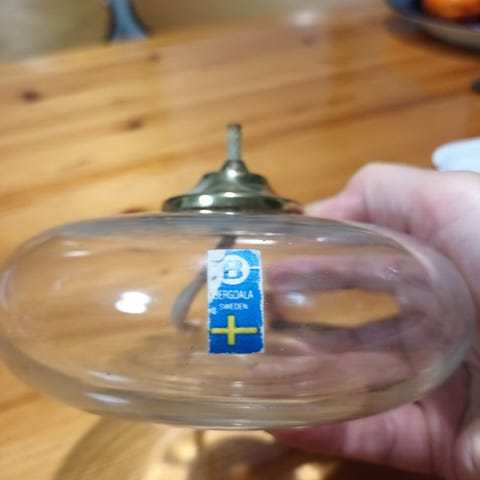 öljy/kerosiinilamppu. Tämä on tehty pylväänmuotoisella maito/kuonalasijalustalla, messinkisellä polttimella ja punaisella lasipallovarjositimella. Tämä on tehty 1950-luvulla ja pohjassa leima Made in Japan.