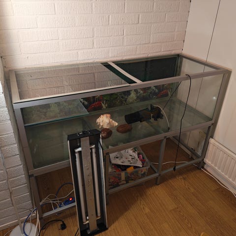 Akvaario on ollut käytössä kauan ja siinä on jotain käytön jälkiä ja mm. päällys laseissa kalkkeutumaa. Yleisilme on siisti. Vesi on tyhjennetty lokakuussa -25 ja akvaario on säilytyksessä sisätiloissa. Jos olet kiinnostunut, voi käydä katsomassa/ laitan lisäkuvia tarvittaessa.