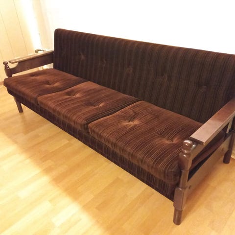 Kunnon puusta tehty 60-luvun vuodesohva. Selkeä muotokieli eli helppo päällystää sohva haluttaessa uudestaa. Nykyinen päällys hyväkuntoinen 80-luvun kuosi.
