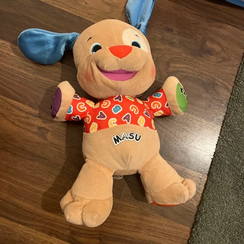 Fisher-Price lasten pehmolelu, esittää koiraa. Pehmolelu on väriltään monivärinen ja valmistettu pehmeästä materiaalista. Sopii lasten leikkeihin ja kehittää aistimuksia. Soittaa musiikkia /kertoo asioita painamalla eri vartalon osia >keltainen jalka painike ei toimi, muut napit kunnossa. Lisäksi olen korjannut toista korvaa >tästä kuva 3. Yleisilme siisti, vaikka pientä tahraa on havaittavissa.