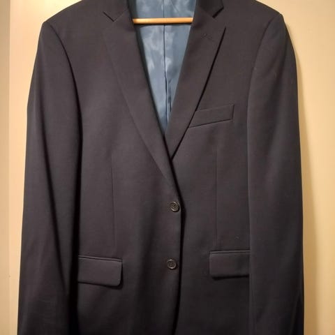 Takissa pieni kipinän jälki, näkyy kuvassa. Takki kokoa 52. Housut kokoa 38/32. Puku kerran käytetty ja siisti.