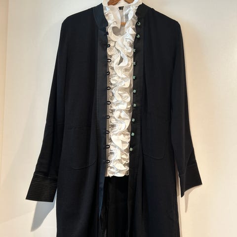 Musta lyhythihainen neule solmittavalla rusettinauhalla. Laadukkaan tuntuinen materiaali 70% silkkiä ja 30% viskoosia. Materiaali on melko paksua ja jämäkän tuntuista.