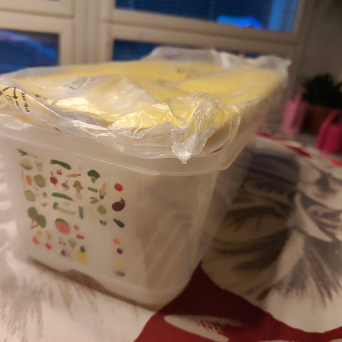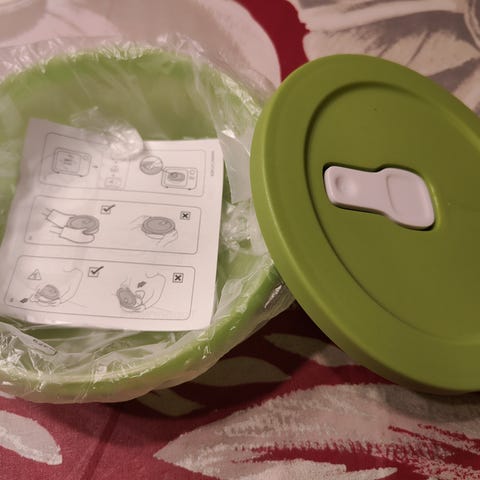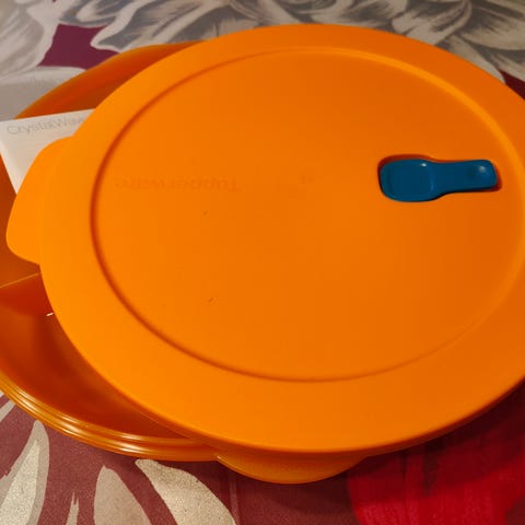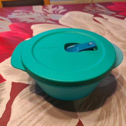 Uusi, avaamattomassa paketissa oleva Tupperwaren Vent N Serve ruokien/aterioiden lämmittämiseen mikroaaltouunissa. Kannessa on venttiili.