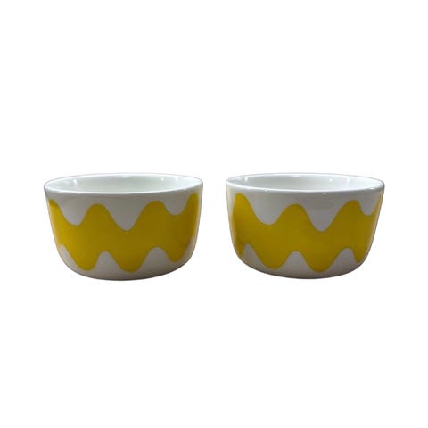 Kaksi aurinkoisen keltaista pientä kulhoa, vetoisuus 2,5dl. En löydä kunnossa huomautettavaa.