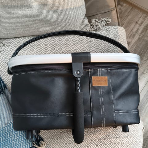 Tyylikäs keinonahkainen sivukori sivulaukku NXT90-vaunuihin. Mustassa muovireunassa vähän naarmua (näkyy kuvissa). Keinonahka kauttaaltaan hyvässä kunnossa.