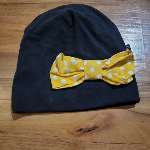 Lasten trikoo pipo, jossa ruusuke. Koko 52 cm. Ruusuke hieman värjääntynyt.