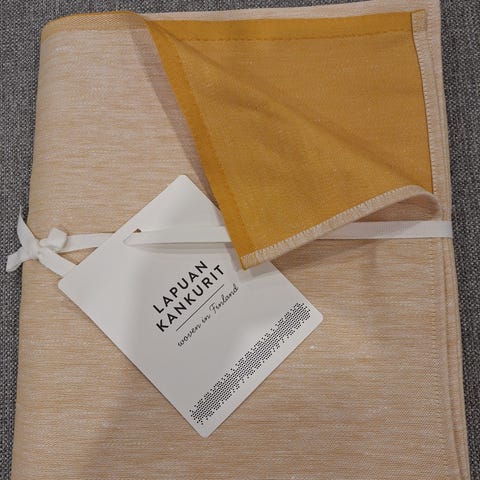 Myydään käyttämätön Lapuan Kankurit pöytäliina, koko 140*240 cm, ja 12kpl serviettiä, joiden koko noin 39*39cm.
