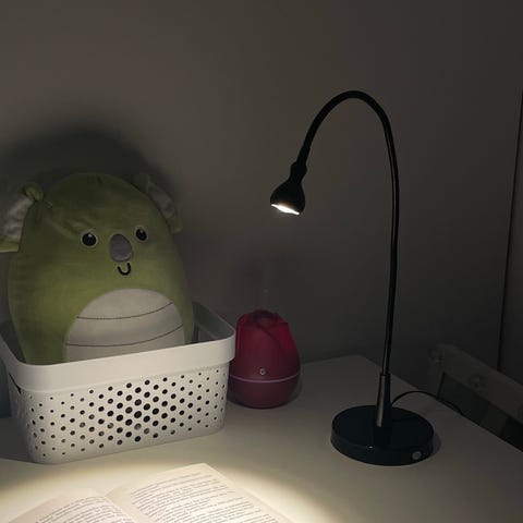 IKEA pöytälamppu valkoisella varjostimella ja metallijalalla