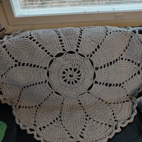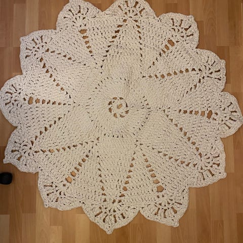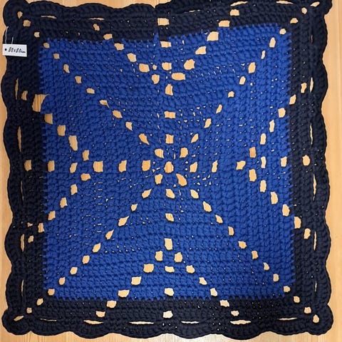 Sinien/ musta vähän käytetty , tukeva virkattu matto 120 cm ×120 cm.