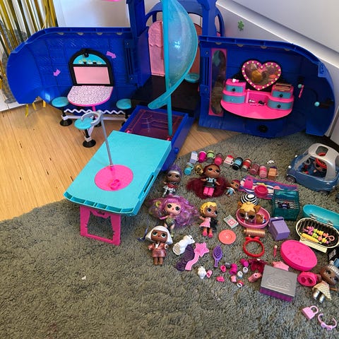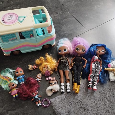 L.O.L. bussi tarvikkeineen. Lisäksi isosisko nukke.