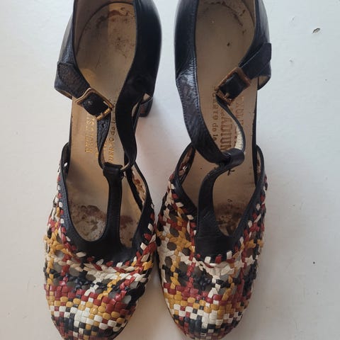 Tyylikkäät korkokengät 1980-luvulta, mustaa samettia ja kultaa, edessä iso musta kukka, pohja kulunut, muuten siisti