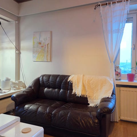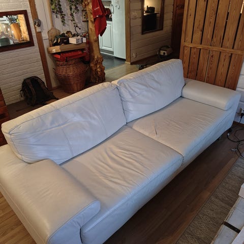 Muutamia kissan kynnen jälkiä selkänojan päällä ja jotakin nestettä joskus sohvalle kaatunut (vuosia vanha tahra, ei ole yritetty pestä), mikä näkyvissä vain istuinosan alla (näkyvät kuvissa).