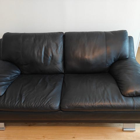 Vanha päivittäiskäytössä ollut ruskea nahkasohva.
