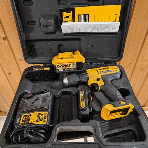 DeWalt porakone. Tuotteet toimitetaan kovassa muovisessa säilytyskotelossa.
