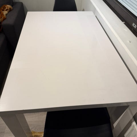 Korkeakiilto ruokapöytä, valkoinen, koko 2 mx 1m. Iso ruokapöytä, valkoinen korkeakiilto pöytä. Haku Joutsasta.
