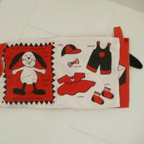 Toisen merkki Way play, Kirjassa on pehmeä kulma vaikka puruleluksi ja kätevä rengas, jolla sen saa kiinnitettyä esim. vaunuihin.