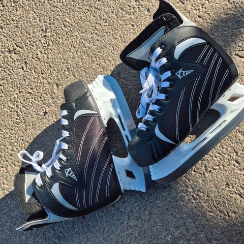 Käytettyjä mutta ehjiä kenkiä, koot 37 - 39. Mukana myös luistimet, jotka ehjät, mutta tarvitsee teroittaa. Luistimista en löytänyt koko merkintää. Myydään yhtenä pakettina.
