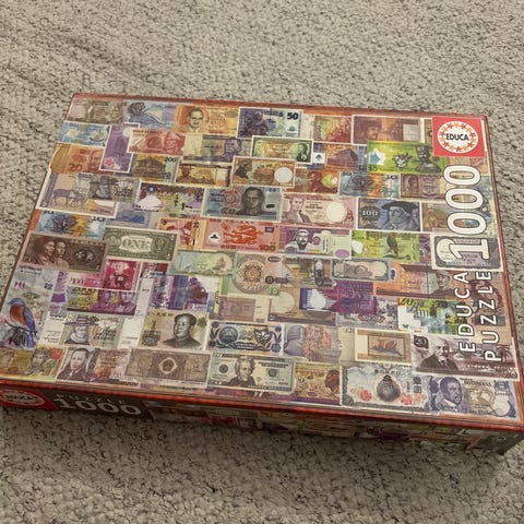 Palapeli, jossa 1000 palaa. Merkki: Wild horse. Koko 49 x 69 cm. Aihe: Maisema Ruotsista: Mariefredin kaupunki, kirkko ja joki. Palapeli on avaamaton ja siinä on muovikalvo jäljellä mutta kalvon alle on yhdessä kulmassa hiipinyt kosteutta, joten kotelon kulmassa kosteusvaurio.