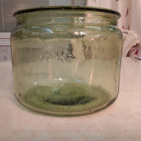 Kyljessä karhu-logo ja alla 3 ltr. Väriltään vihertävä. Ehjä, mutta pohjassa on naarmuja sisä- ja ulkopuolella, suuaukossa on "riksuja" vuosien käytöstä. Lasimassassa on ajalle tyypillisiä ilmakuplia ja epätasaisuutta. Kork. 15 cm, pohjan halk. 20 cm ja suuaukon halk. 19 cm.