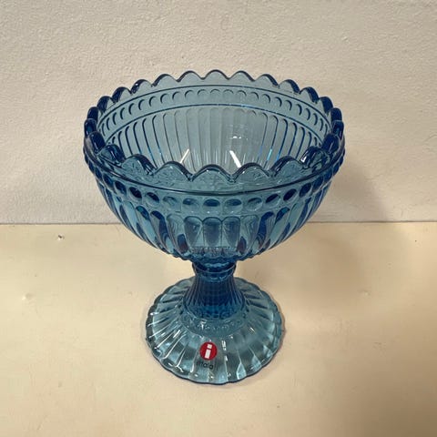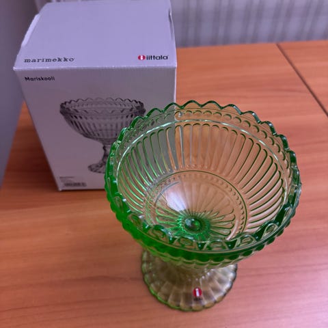 Iittala vihreä lasinen koristekulho, jossa on koristeellinen muotoilu ja jalusta. Kulho on valmistettu lasista ja sopii koriste-esineeksi tai tarjoilukulhoon.