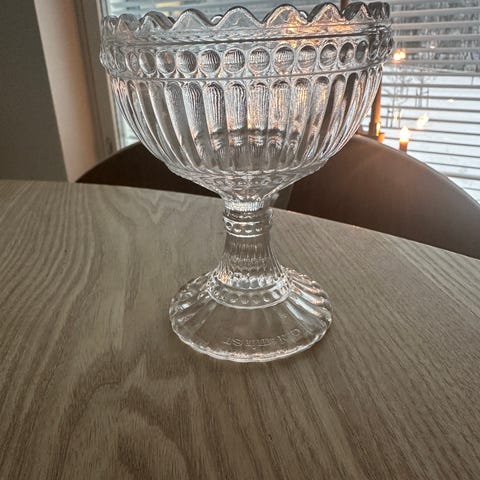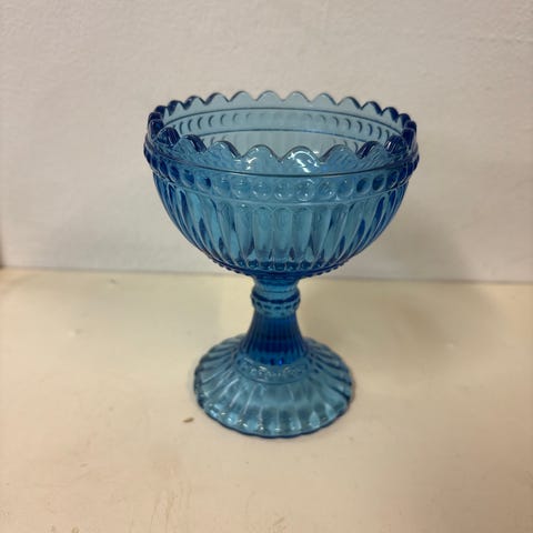 Marimekko malja sinisestä lasista. Malja on koristeellinen ja soveltuu esimerkiksi jälkiruokien tai pienten esineiden tarjoiluun tai säilytykseen.