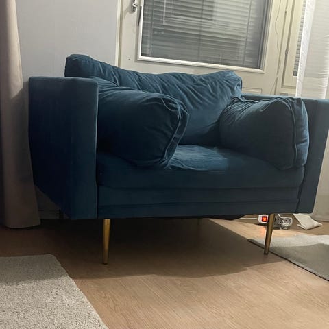 Sininen kangasverhoiltu sohva, jossa on napitettu selkänoja ja puiset jalat. Sopii olohuoneen tai muun oleskelutilan kalusteeksi.