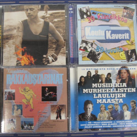 Myydään kotimaisia kokoelma cd-levyjä 3,00 euroa kappale. Kaikki cd:t kuunneltu ja todettu toimiviksi. Cd:ssä voi olla naarmuja & kansipapereissa jälkiä/omistuskirjoituksia, mutta cd-kotelot ovat ehjät. Postituskulut ostajalle ja noutokin sovittavissa.